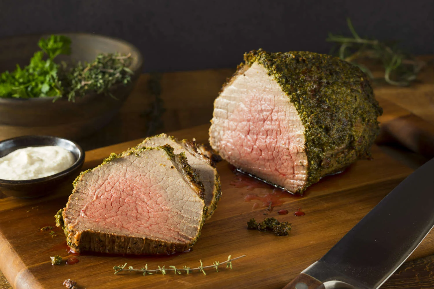 Preheat oven to 325 degrees F. Combine herbs, garlic and oil in a bowl. Season roast generously with salt and pepper. Rub roast with herb oil. Roast in oven for 45 minutes or until meat thermometer reads 140 degrees F. Take the roast out of oven and wrap in foil. Let rest for 10 minutes. Slice thinly and enjoy!